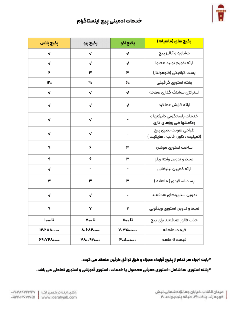 پرو | همه خدمات اکو + پاسخگویی دایرکت/کامنت، طراحی هویت بصری، ۶ پست گرافیکی، ۹۰ استوری، تدوین سناریوهای هدفمند، ۷ استوری ویدئویی، جذب تا ۷۰۰ فالوور هدفمند | ۸,۶۸۰,000 تومان |